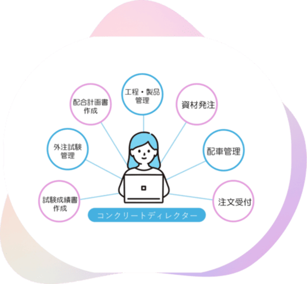 これまで、生コン工場では「試験係」がすべての技術業務(品質管理・試験成績作成・検査部署管理等)を一手に引き受け活動してきました。しかしながらその業務範囲の広さは試験係の負担となっていました。